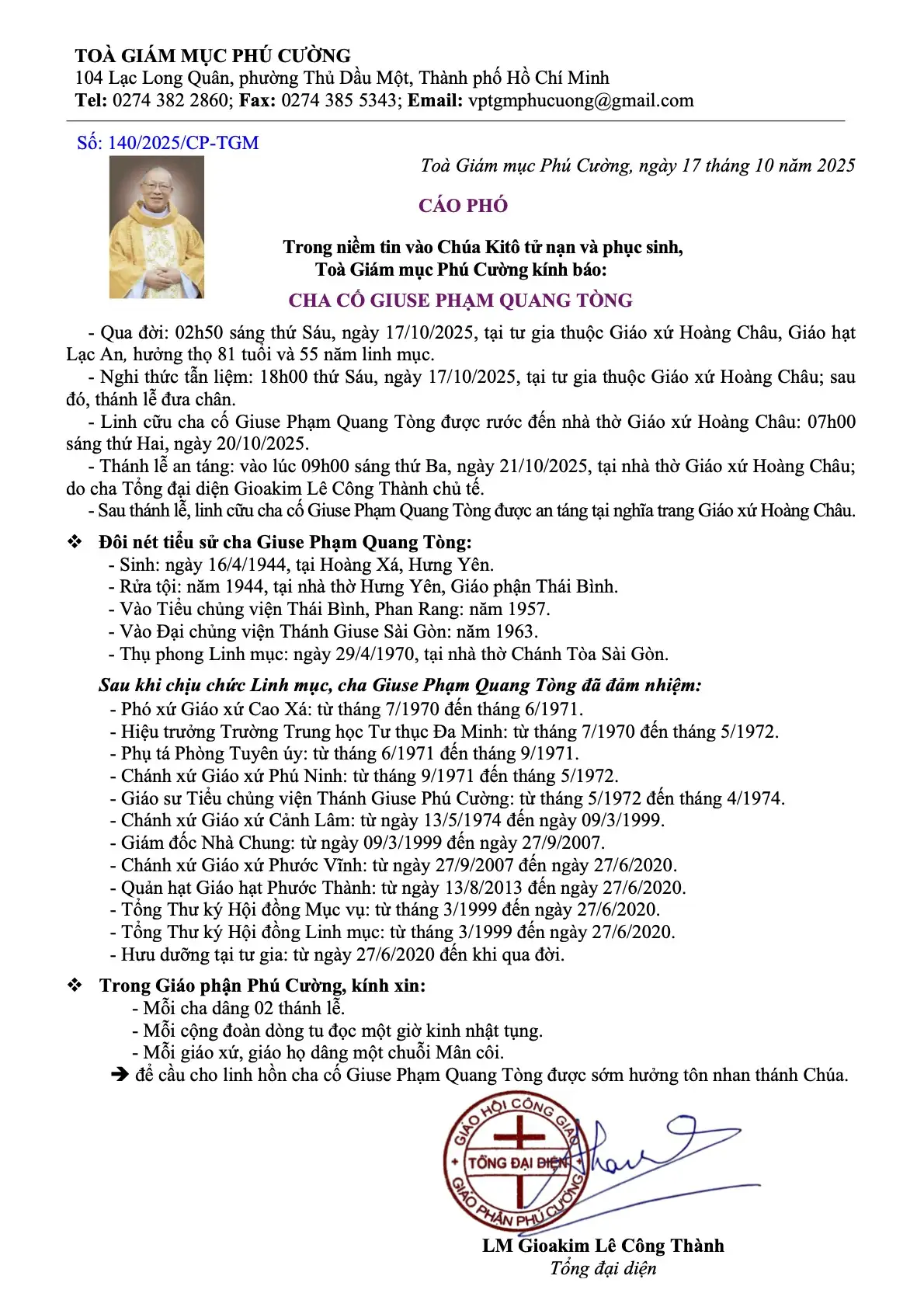 - Linh cữu cha cố Giuse Phạm Quang Tòng được rước đến nhà thờ Giáo xứ Hoàng Châu: 07h00 sáng thứ Hai, ngày 20/10/2025.