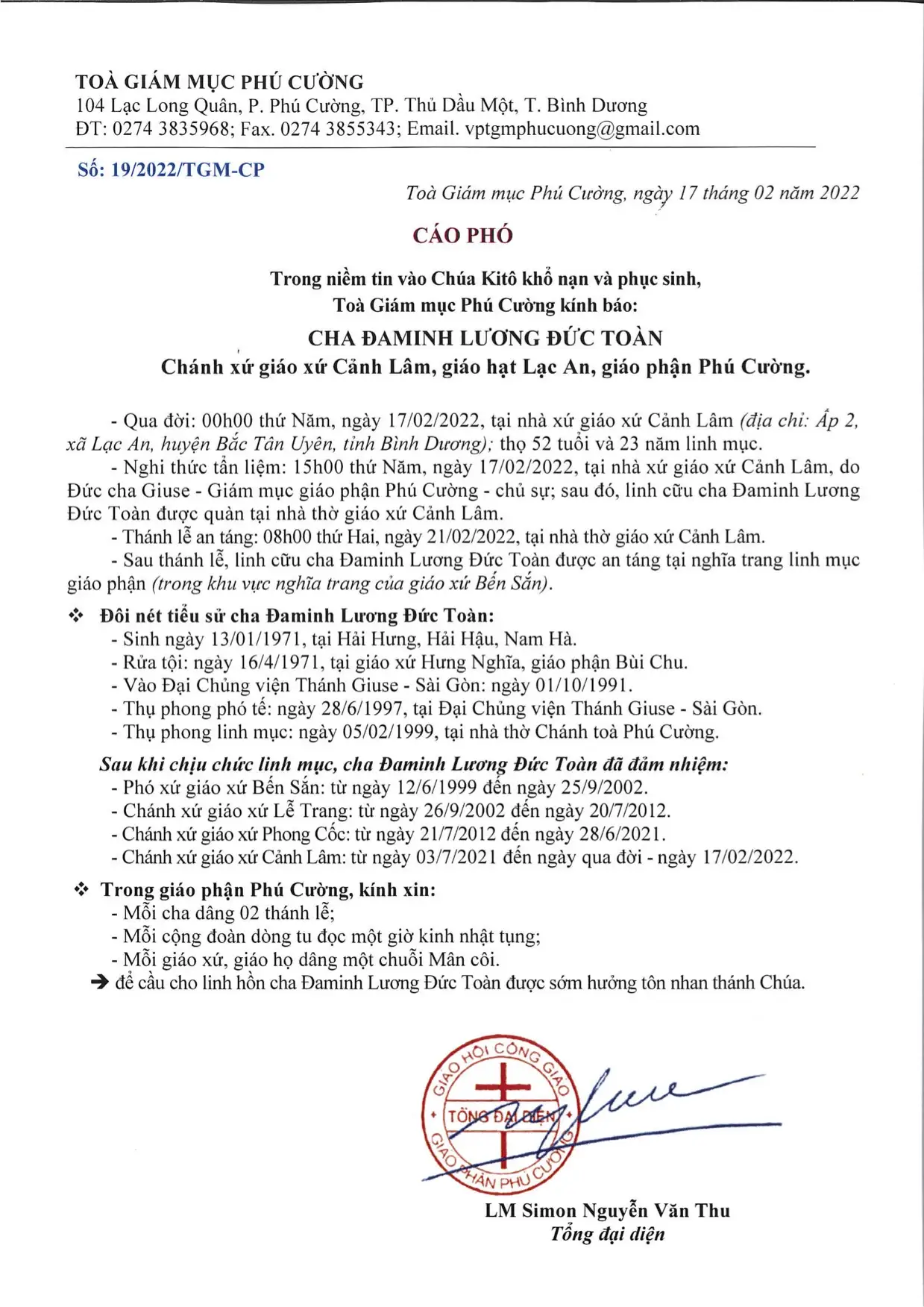 CÁO PHÓ: CHA ĐAMINH LƯƠNG ĐỨC TOÀN