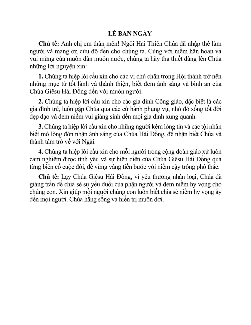 1. Chúng ta hiệp lời cầu xin cho các vị chủ chăn trong Hội thánh trở nên những mục tử tốt lành và thánh thiện, biết đem ánh sáng và bình an của Chúa Giêsu Hài Đồng đến với muôn người.