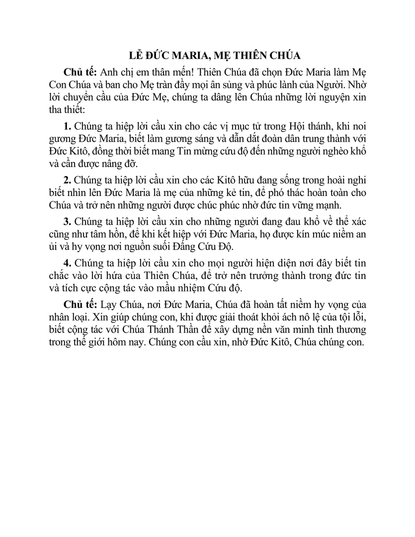 Lời nguyện chung Lễ Đức Maria, Mẹ Thiên Chúa | Giáo Phận Phú Cường