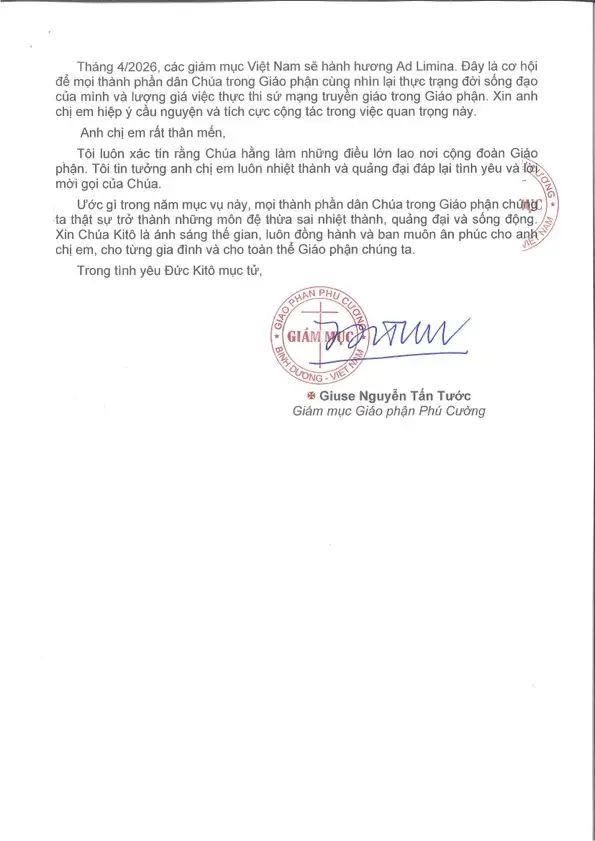 Tháng 4/2026, các giám mục Việt Nam sẽ hành hương Ad Limina. Đây là cơ hội để mọi thành phần dân Chúa trong Giáo phận cùng nhìn lại thực trạng đời sống đạo của mình và lượng giá việc thực thi sứ mạng truyền giáo trong Giáo phận. Xin anh chị em hiệp ý cầu nguyện và tích cực cộng tác trong việc quan trọng này.