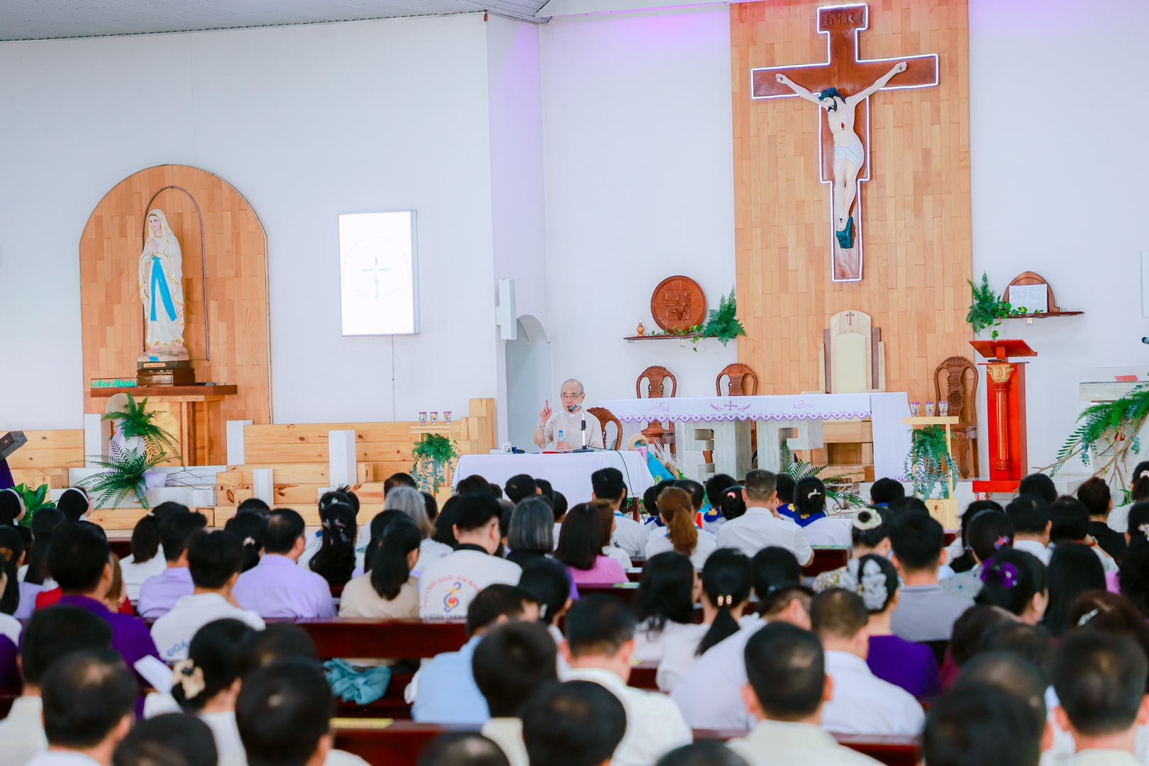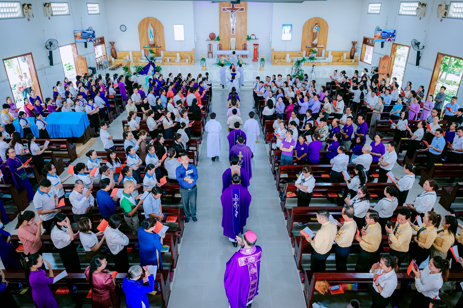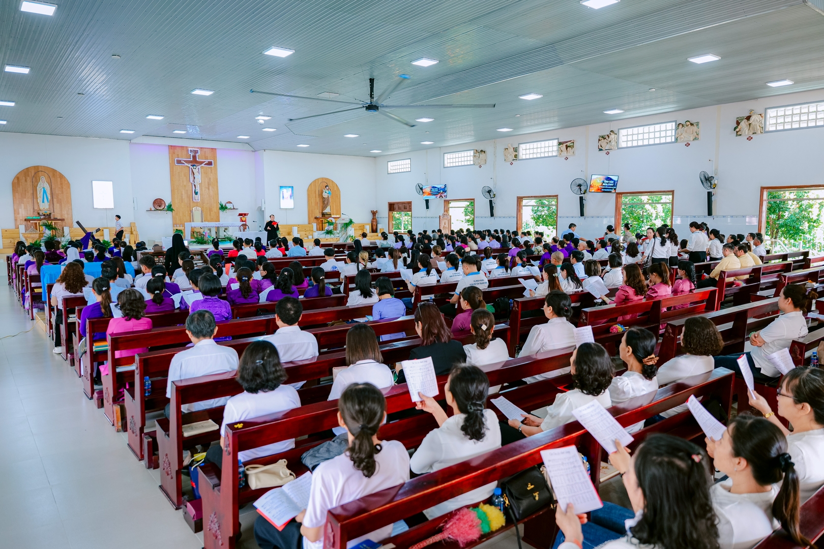 Giáo xứ Mỹ Hảo, 08/03/2026 – Vào lúc 8g30 sáng Chúa Nhật III Mùa Chay, hơn 600 anh chị em ca viên trong Giáo phận đã có mặt tại Giáo xứ Mỹ Hảo để tham dự buổi tĩnh tâm Mùa Chay. Đúng 9g30, cha Vinh Sơn Kiều Duy Tân, Đặc trách Ban Thánh Nhạc Giáo phận, đã ôn lại bài hát chủ đề Năm Phụng vụ 2026 và khai mạc buổi tĩnh tâm. Trong phần khai mạc, ngài giới thiệu sự hiện diện của cha Rôcô Nguyễn Duy, Tổng Thư ký Ủy ban Thánh Nhạc trực thuộc Hội đồng Giám mục Việt Nam, cùng quý cha trong Ban Thánh nhạc.