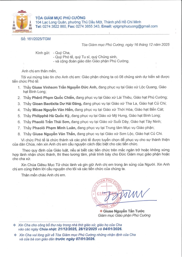 Tòa Giám mục Phú Cường, ngày 16 tháng 12 năm 2025