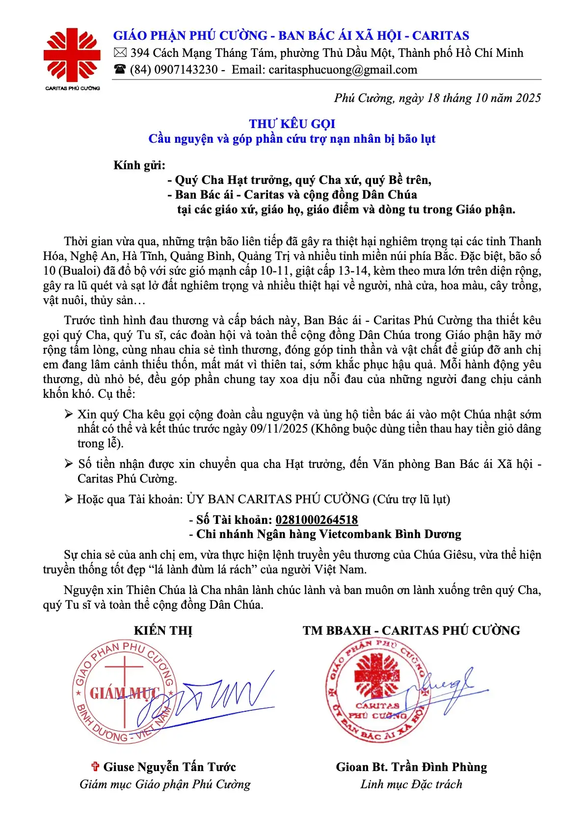 Trước tình hình đau thương và cấp bách này, Ban Bác ái - Caritas Phú Cường tha thiết kêu gọi quý Cha, quý Tu sĩ, các đoàn hội và toàn thể cộng đồng Dân Chúa trong Giáo phận hãy mở rộng tấm lòng, cùng nhau chia sẻ tình thương, đóng góp tinh thần và vật chất để giúp đỡ anh chị em đang lâm cảnh thiếu thốn, mất mát vì thiên tai, sớm khắc phục hậu quả. Mỗi hành động yêu thương, dù nhỏ bé, đều góp phần chung tay xoa dịu nỗi đau của những người đang chịu cảnh khốn khó. Cụ thể: