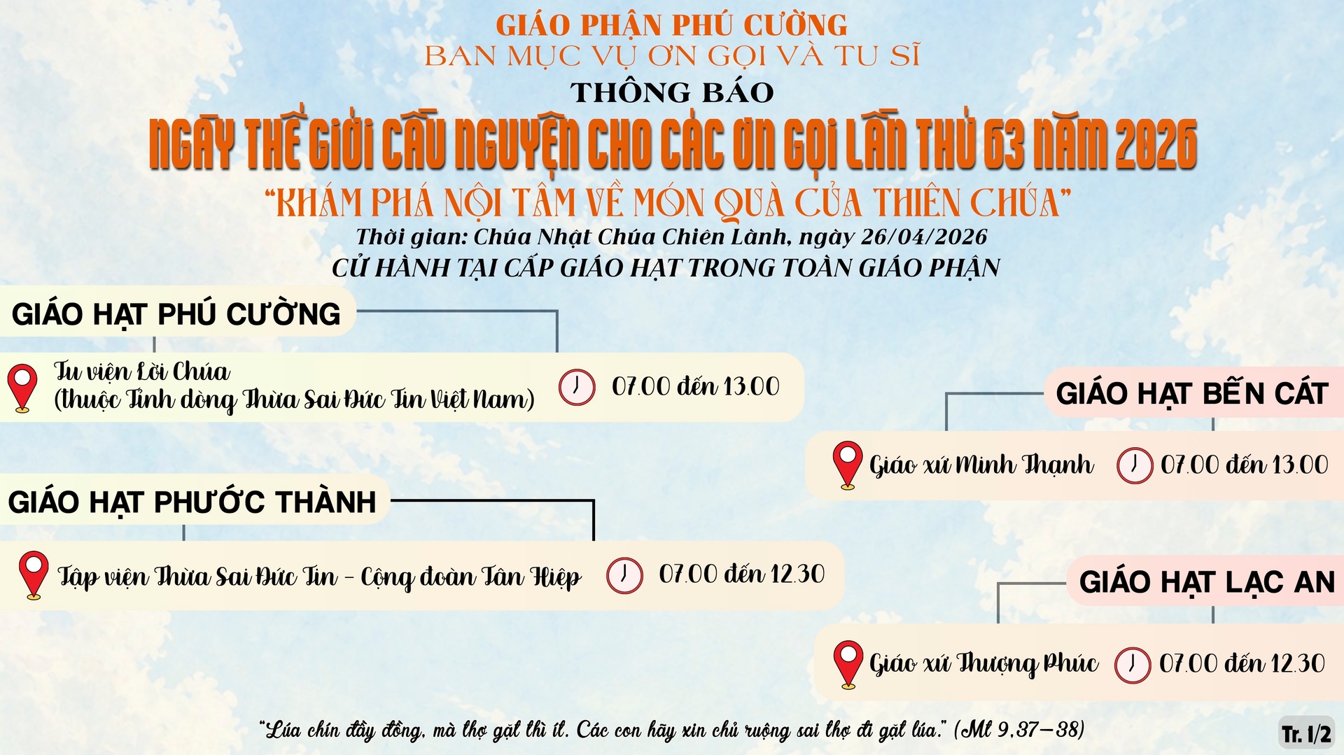 THÔNG BÁO: CỬ HÀNH NGÀY THẾ GIỚI CẦU NGUYỆN CHO CÁC ƠN GỌI LẦN THỨ 63 - CHÚA NHẬT CHÚA CHIÊN LÀNH, NGÀY 26/4/2026 - TẠI CẤP GIÁO HẠT