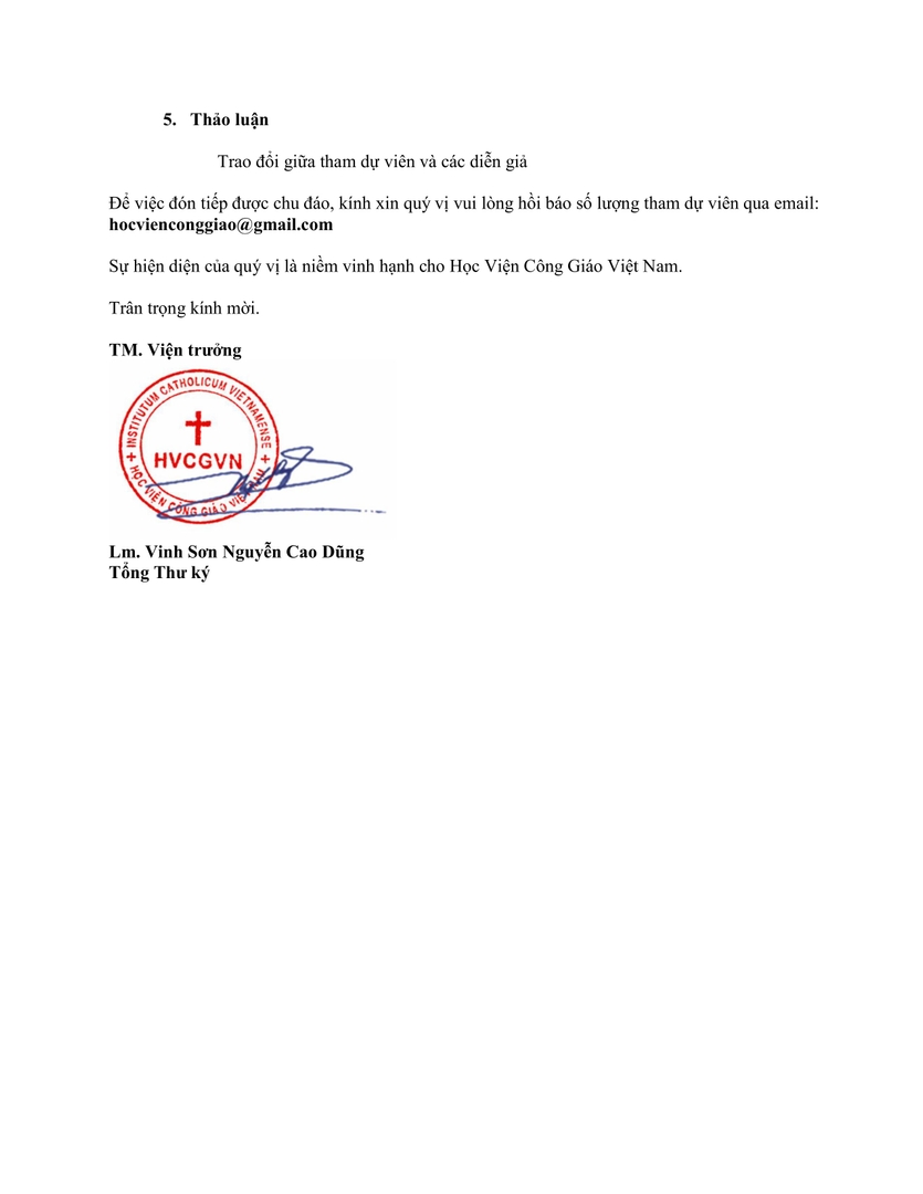 Để việc đón tiếp được chu đáo, kính xin quý vị vui lòng hồi báo số lượng tham dự viên qua email: hocvienconggiao@gmail.com