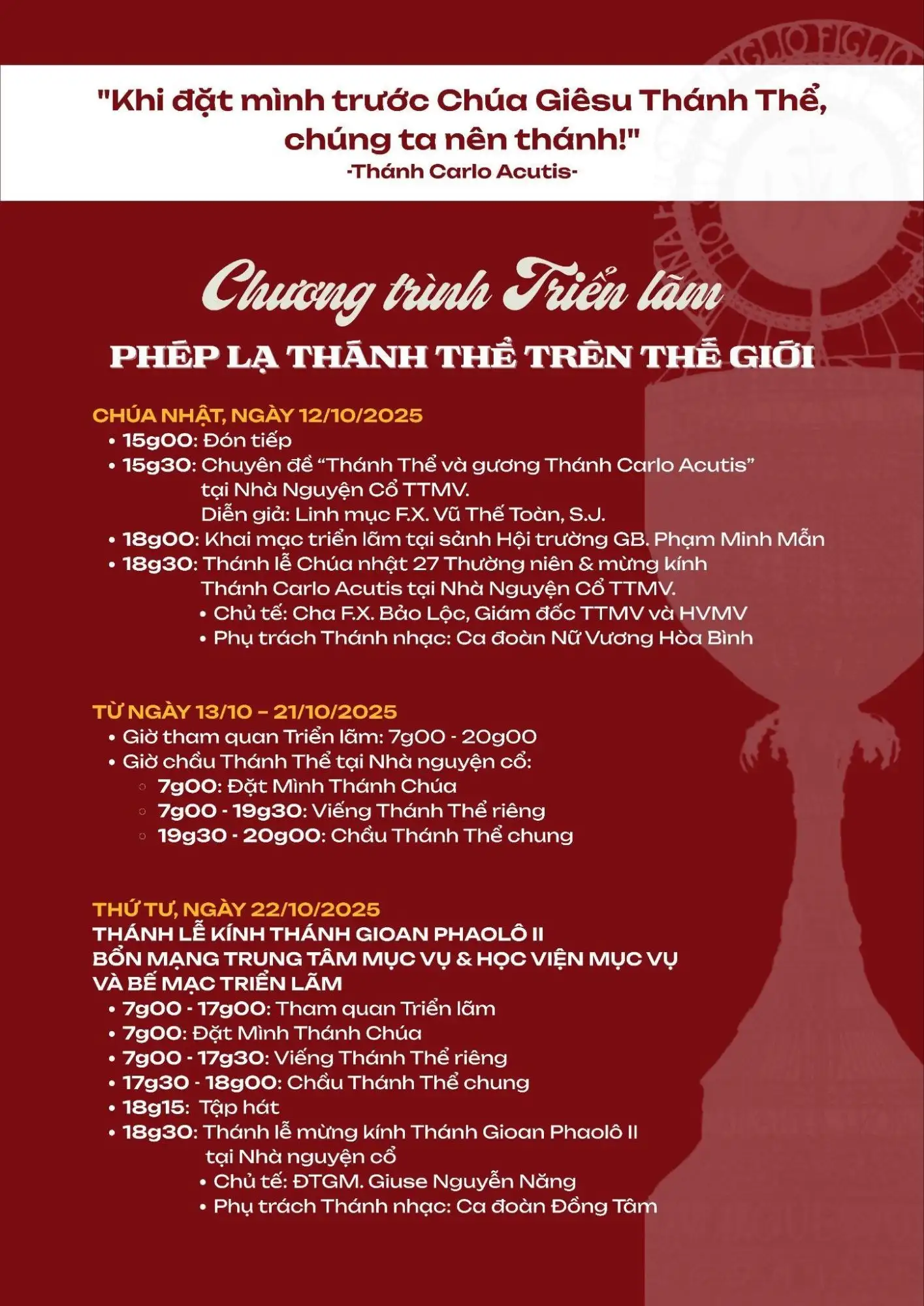 Triển lãm của Thánh Carlo Acutis về “Phép Lạ Thánh Thể Trên Thế Giới” sẽ được trình bày và trưng bày tại Trung tâm Mục vụ (TTMV) Tổng Giáo phận Sài Gòn (TGPSG) từ ngày 12/10 đến 22/10/2025. Sự kiện này hướng đến lễ kính Thánh Gioan Phaolô II - Bổn mạng của TTMV và Học viện Mục vụ (HVMV) TGPSG - vào ngày 22/10/2025.