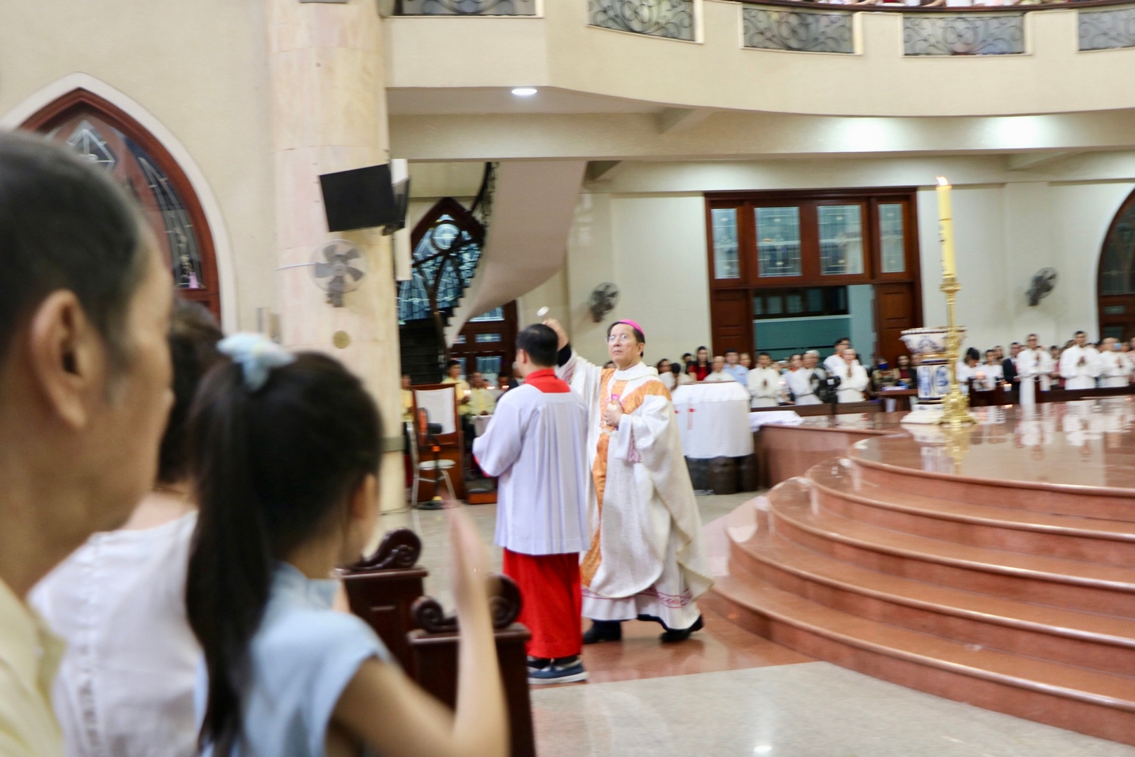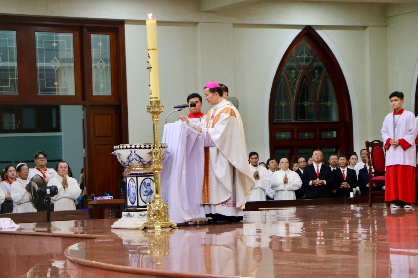 Sau phần phụng vụ Lời Chúa, Đức cha Giuse cử hành nghi thức thánh hóa nước. Cộng đoàn thắp sáng nến và cùng tuyên xưng lại lời cam kết khi chịu phép Rửa tội: từ bỏ ma quỷ và tuyên xưng niềm tin vào Thiên Chúa.
