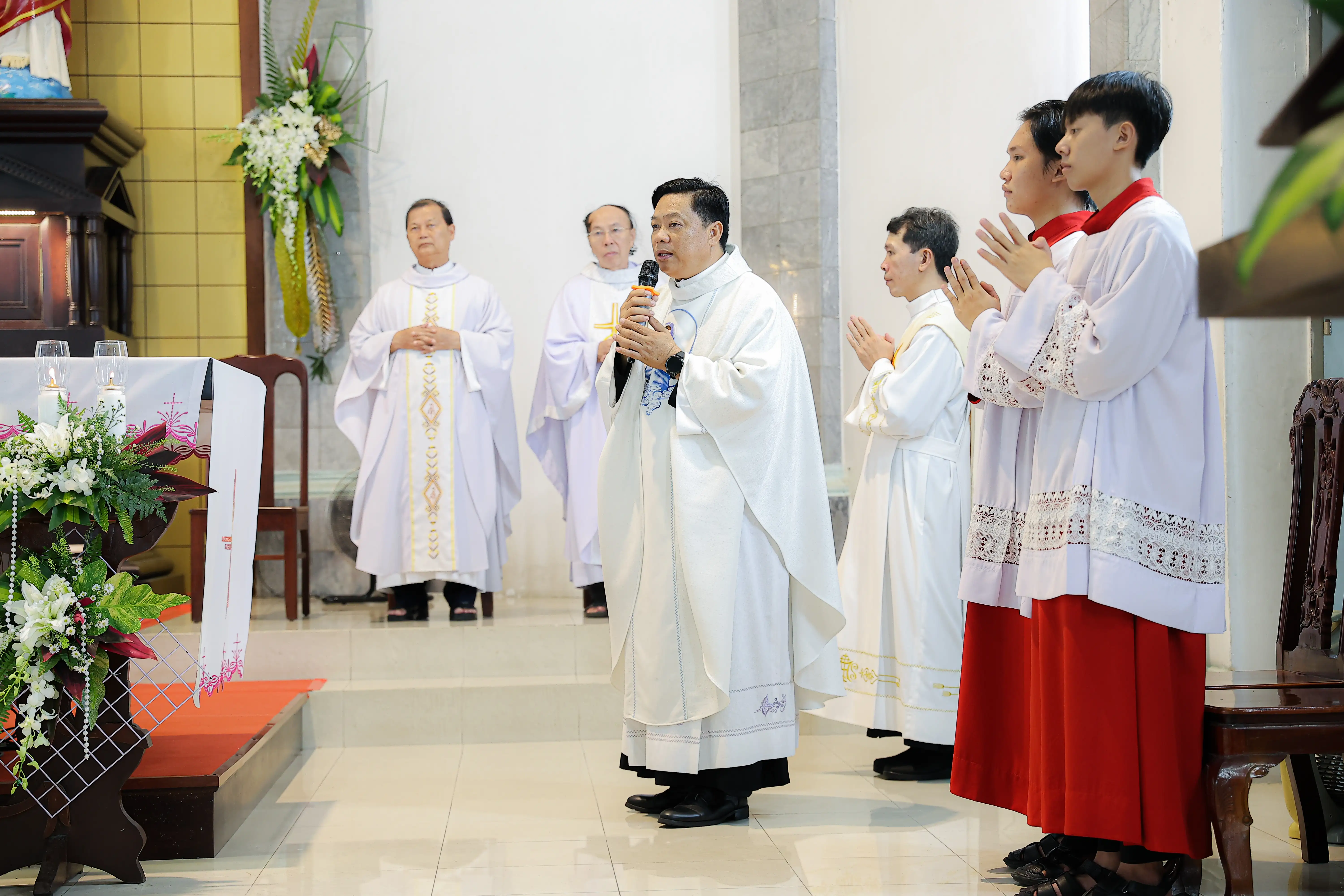 Mở đầu Thánh lễ, Cha Tổng Đại diện chia sẻ: “Sáu mươi năm qua, chúng ta không thể quên công ơn của các bậc tiền nhân – những người đã dấn thân gieo hạt giống đức tin trên cánh đồng truyền giáo”. Ngài mời gọi cộng đoàn cùng hướng về tương lai trong tâm tình tạ ơn, khi nhắc lại những hồng ân Thiên Chúa đã thương ban cho Giáo phận – nay gồm 113 giáo xứ, 4 giáo họ, 14 giáo điểm, 208 linh mục cùng đông đảo tu sĩ nam nữ thuộc nhiều hội dòng. Cha cũng kêu gọi mọi người nhớ đến các Đức Giám mục tiền nhiệm: Đức cha Giuse Phạm Văn Thiên, Đức cha Giacôbê Huỳnh Văn Của, Đức cha Luy Hà Kim Danh, cha cố Tổng Micae Lê Văn Khâm, Đức cha Phêrô Trần Đình Tứ, và đặc biệt cầu nguyện cho Đức cha đương nhiệm Giuse Nguyễn Tấn Tước – vị mục tử đang tiếp nối sứ mạng dẫn dắt đoàn chiên trong thời đại mới.