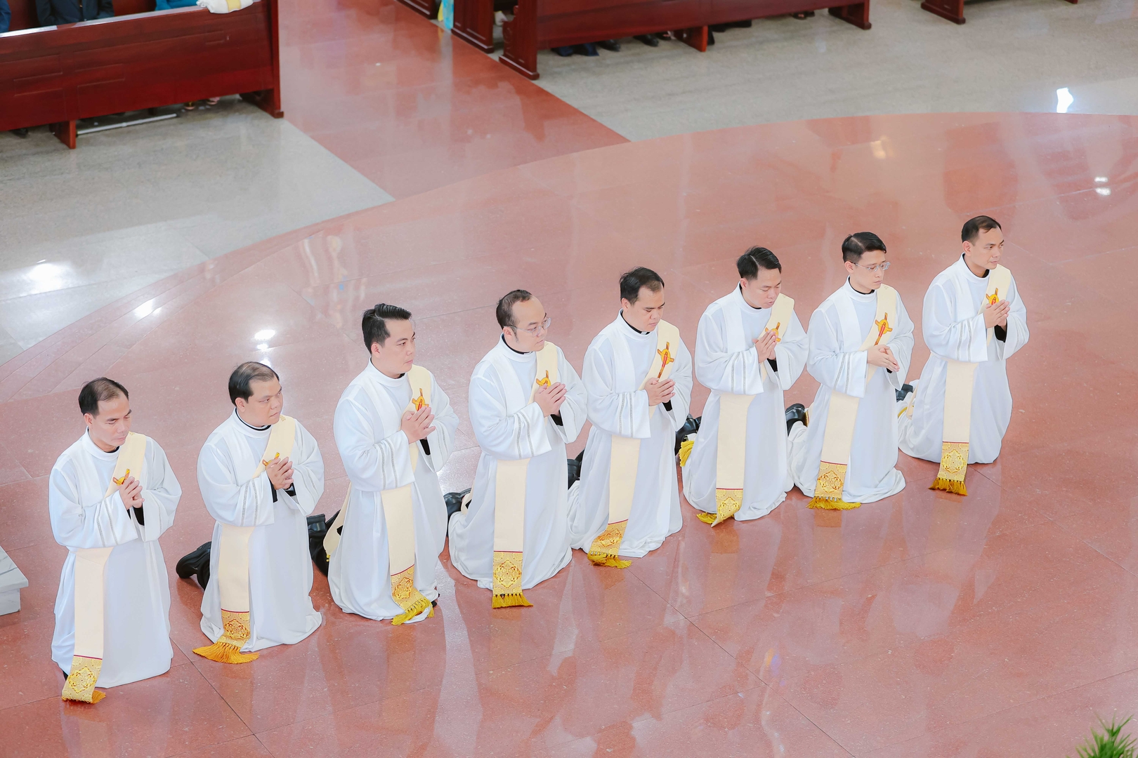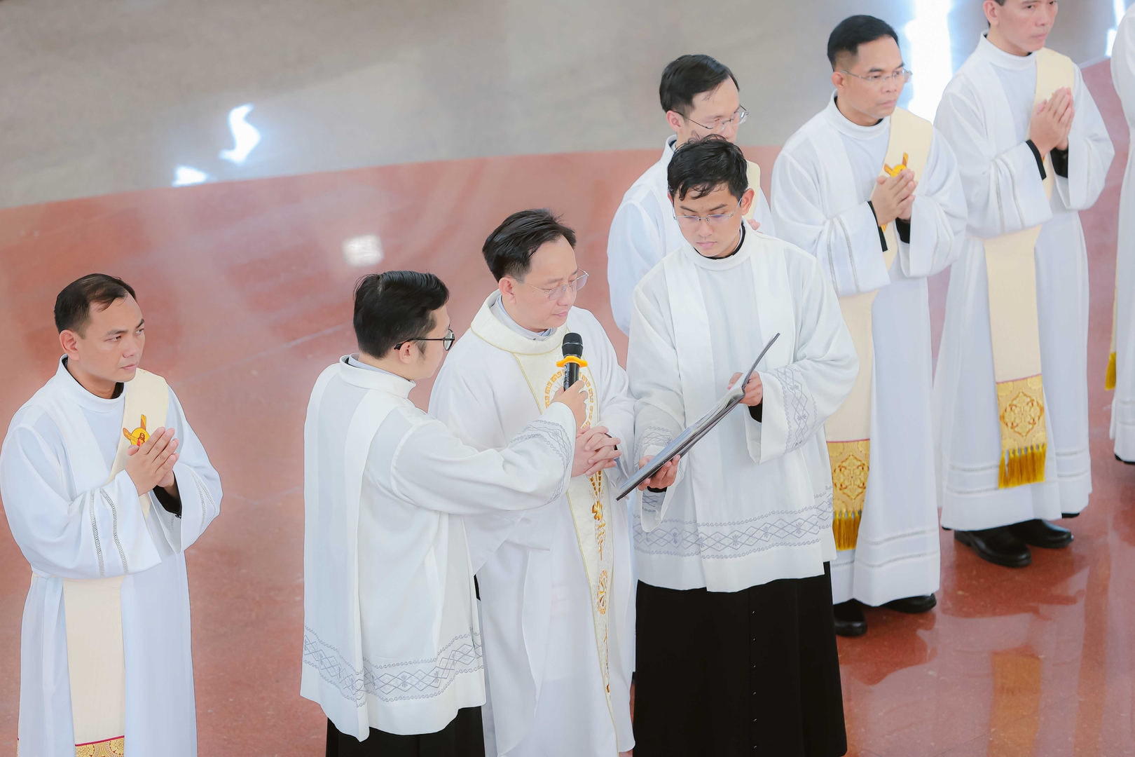 Sau kinh cầu Các thánh, nghi thức trung tâm của Bí tích Truyền chức thánh được cử hành: Đức cha đặt hai tay trên đầu từng tiến chức. Tiếp theo, toàn thể quý cha đồng tế cũng lần lượt tiến lên đặt tay – dấu chỉ hiệp thông trong cùng một chức tư tế. Đức cha giang tay đọc lời nguyện phong chức, xin Chúa Cha ban Thần Trí thánh hóa và ơn chức chức thánh trên các tiến chức.