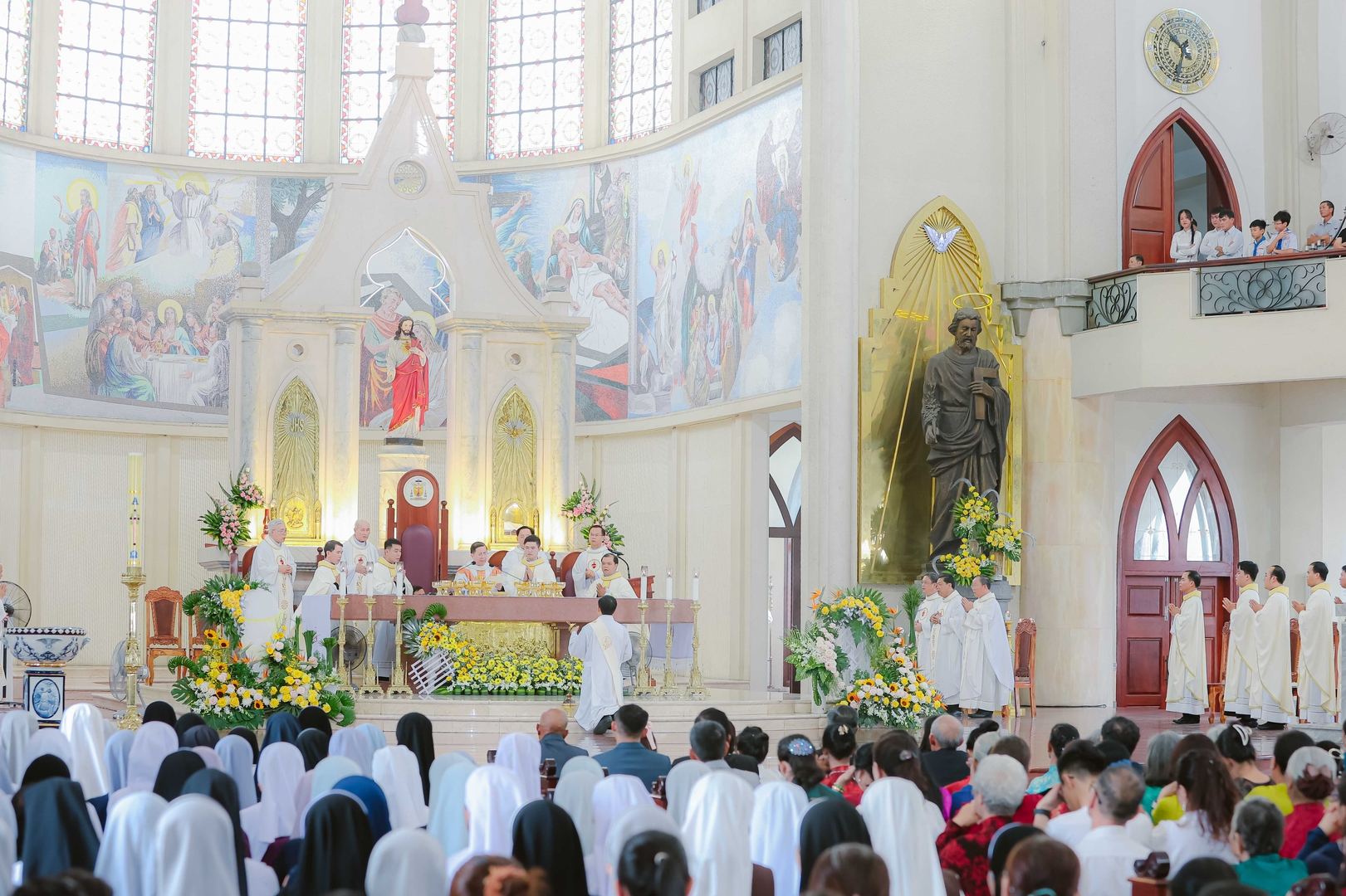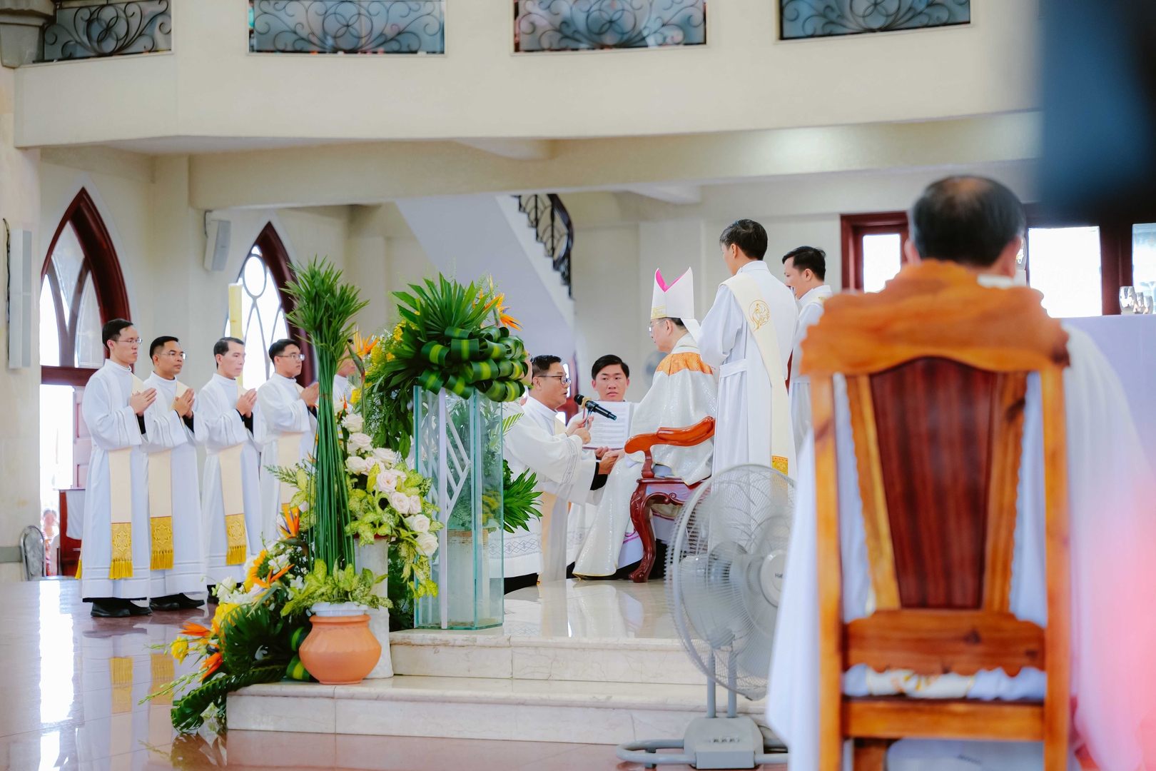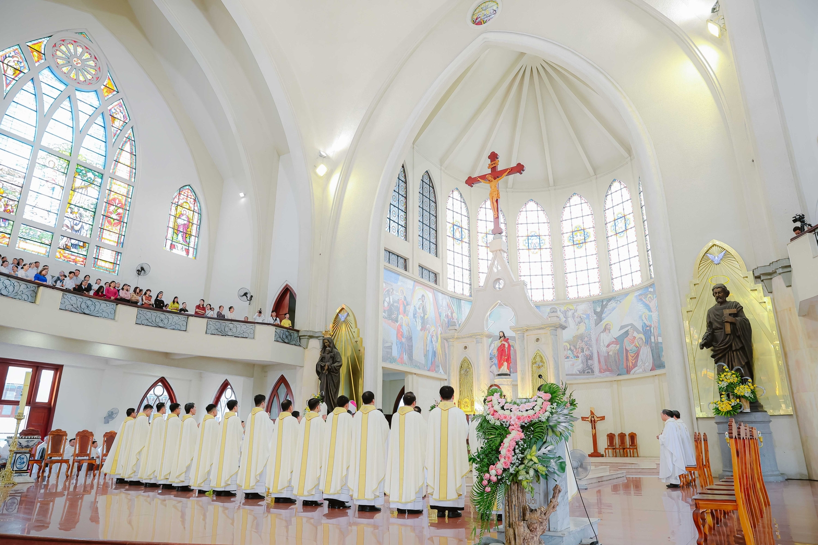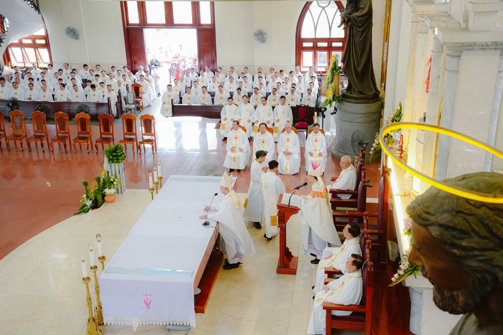 Nhà thờ Chánh Tòa Phú Cường, 09/4/2026 – Vào lúc 8g30, Thánh lễ phong chức Linh mục được cử hành tại Nhà thờ Chánh Tòa Phú Cường, do Đức cha Giuse Nguyễn Tấn Tước – Giám mục Giáo phận Phú Cường – chủ sự. Đồng tế trên bàn thờ với Đức cha Giuse có: Đức cha Phêrô Trần Đình Tứ – nguyên Giám mục Giáo phận Phú Cường, cha Tổng đại diện Gioakim Lê Công Thành, cha Giám đốc Đại Chủng viện Thánh Giuse Sài Gòn, cha Bề trên Dòng Mẹ Chúa Cứu Chuộc, cùng hơn 160 linh mục trong và ngoài Giáo phận. Hiện diện trong Thánh lễ còn có đông đảo quý tu sĩ nam nữ, gia đình, thân nhân và ân nhân của quý tân chức, cùng bà con giáo dân tham dự.