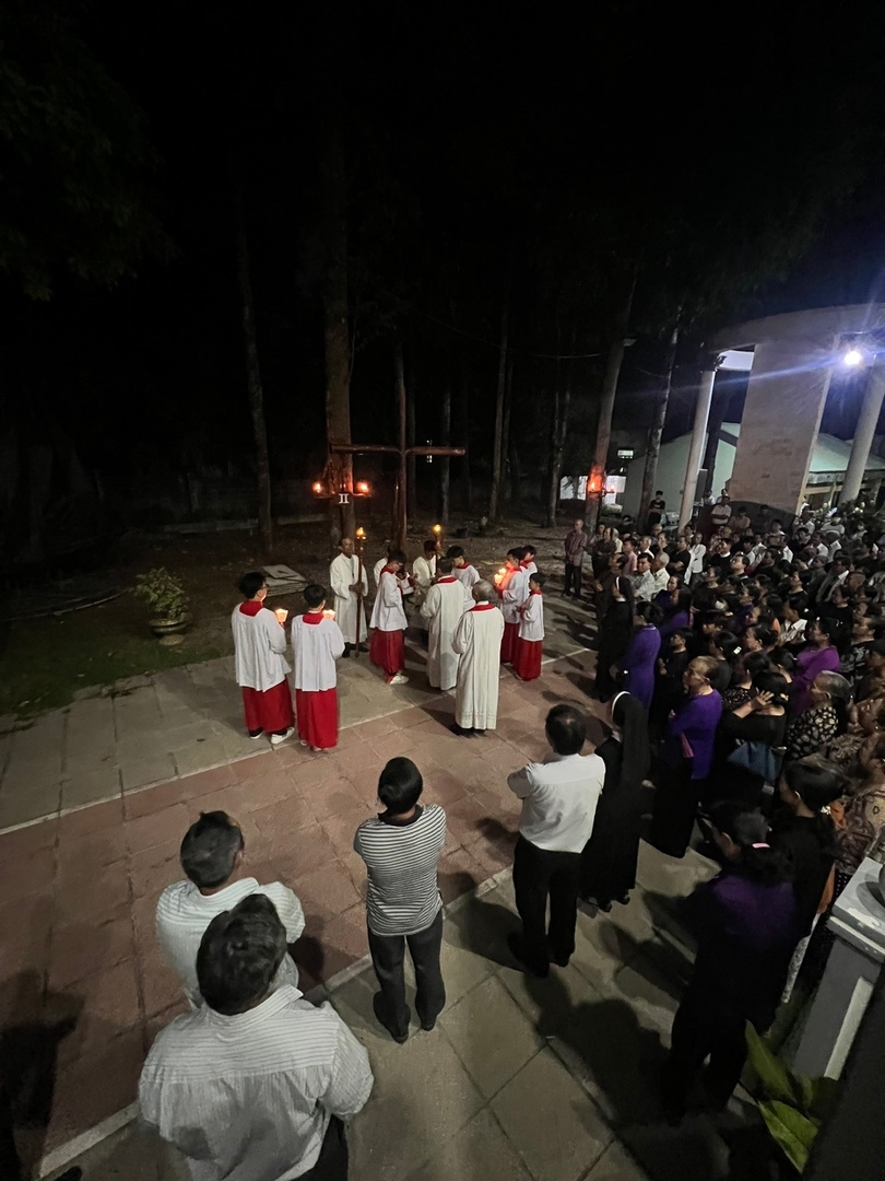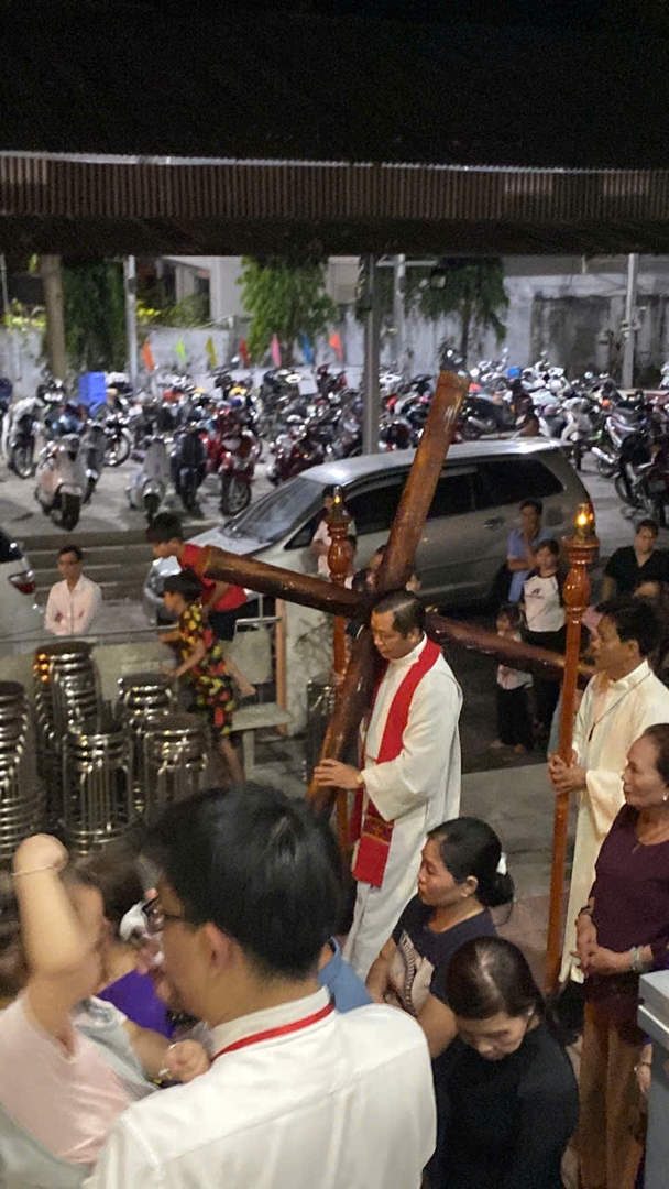Vào lúc 18g30, đông đảo giáo dân Giáo xứ Dầu Tiếng tề tựu để tham dự ngắm đàng Thánh Giá. Cha phụ tá Giuse Nguyễn Văn Thiện, CSC. vác Thánh Giá trên vai đi theo từng chặng, cùng những lời suy gẫm và các bài hát giúp cộng đoàn suy niệm sâu hơn về cuộc khổ nạn mà Chúa Giêsu đã chịu vì tội lỗi nhân loại.
