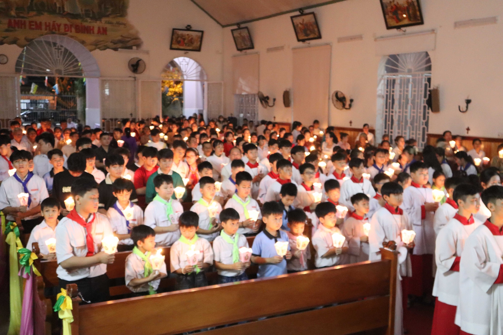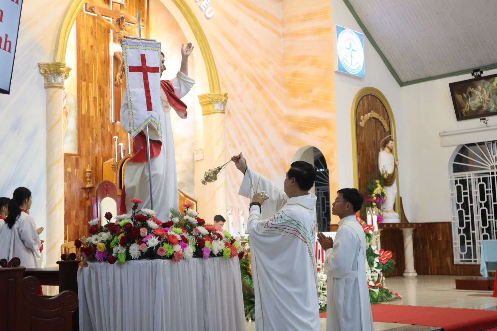 Những bài thánh ca Phục Sinh vang lên hòa quyện với lời kinh, bầu khí phụng vụ sống động và sốt sắng. Khi tiếng chuông nhà thờ vang lên loan báo Chúa đã sống lại, cộng đoàn hân hoan cất cao kinh Vinh Danh. Từ người lớn tuổi đến các em nhỏ, tất cả đều sốt sắng tham dự trong niềm tin vào Chúa Kitô Phục Sinh.