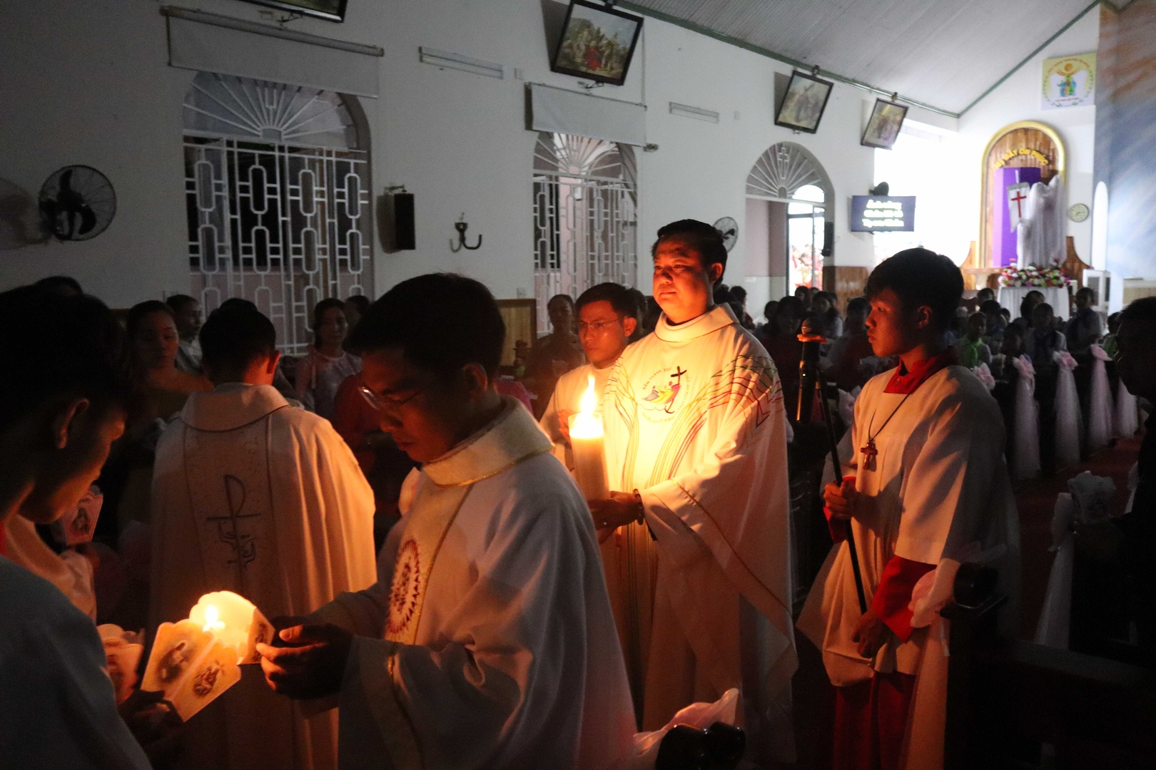 Mở đầu cử hành phụng vụ, cha chánh xứ chủ sự nghi thức làm phép lửa và nến Phục Sinh – biểu tượng của ánh sáng Đức Kitô chiến thắng bóng tối và sự chết. Từ ngọn lửa được thắp lên trong đêm tối, ánh sáng dần lan tỏa, được trao truyền từ cây nến Phục Sinh đến từng người tham dự. Hàng trăm ngọn nến sáng lên trong đêm, tạo nên khung cảnh trang nghiêm và thiêng liêng. Cộng đoàn cùng tiến vào thánh đường và lắng nghe công bố Tin Mừng Phục Sinh.