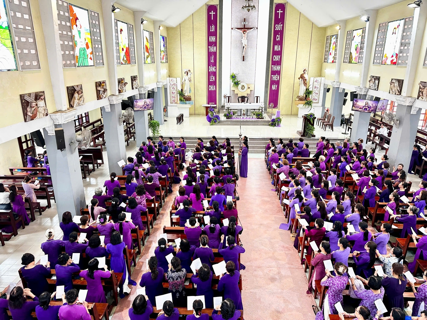 Sau phần giảng tĩnh tâm, các chị em cùng bước vào hành trình thiêng liêng qua 14 chặng Đàng Thánh Giá. Từng bước chân, từng lời nguyện giúp mỗi người hồi tâm, tưởng nhớ cuộc thương khó của Chúa Giê-su – Đấng đã hy sinh mạng sống vì yêu thương nhân loại.