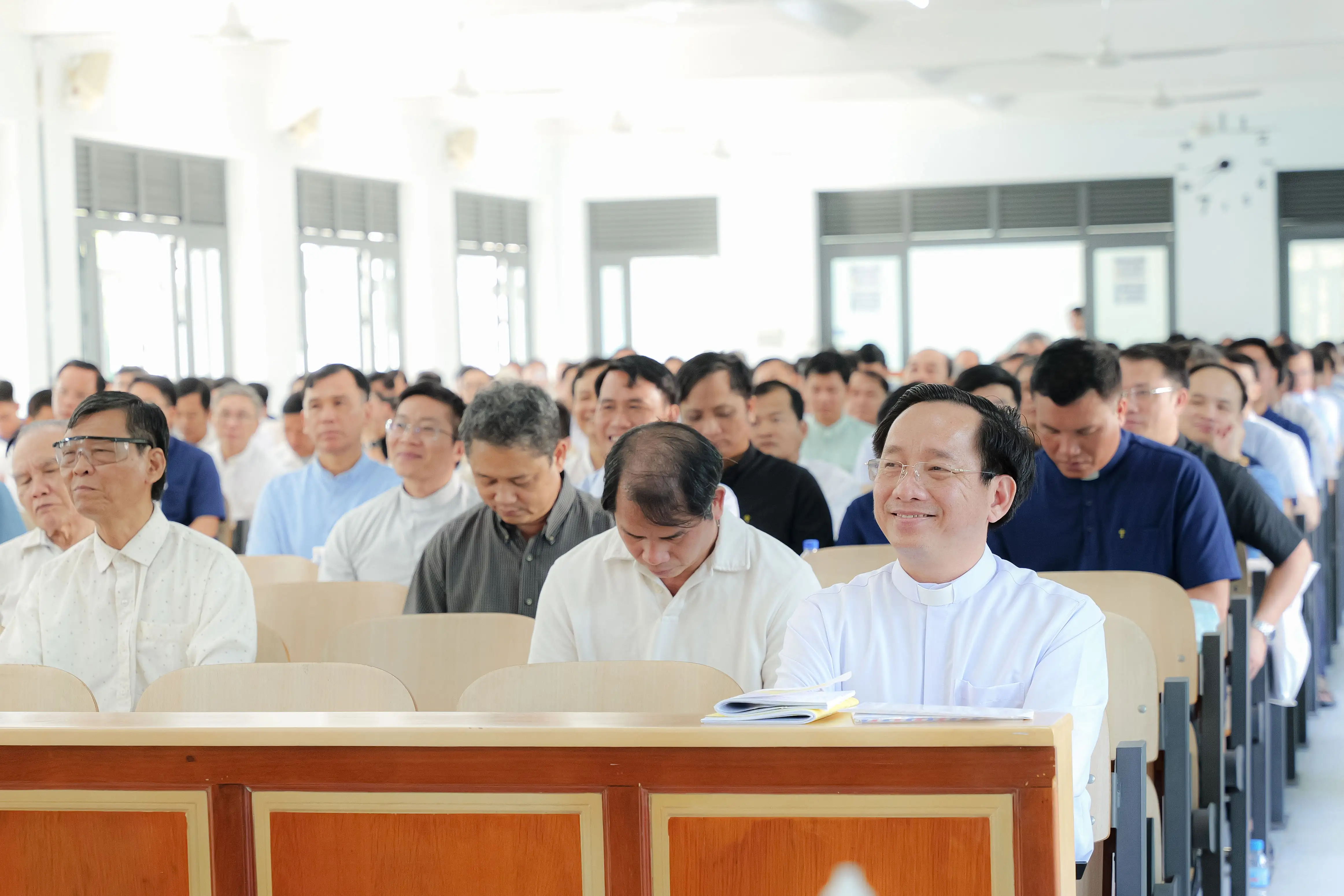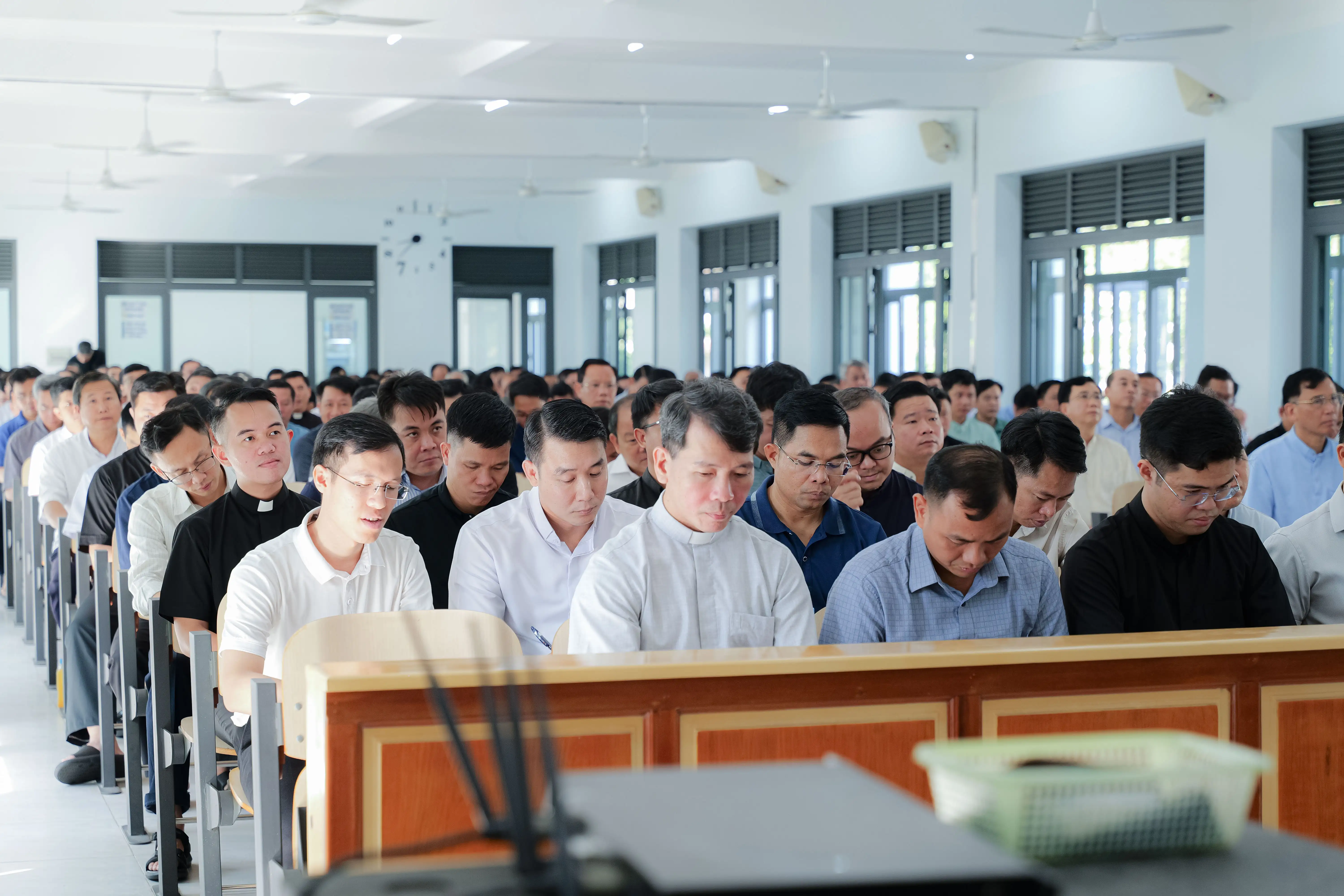 Đến 8h15, quý cha trở lại hội trường đọc Kinh Sách, rồi bước vào phần gặp gỡ và trao đổi mục vụ với Đức cha Giuse. Trong phần chia sẻ, Đức cha trình bày chương trình làm việc để chuẩn bị cho kỳ Ad Limina sắp tới tại Roma, đồng thời mời gọi quý cha, đặc biệt là quý cha Quản hạt, các cha đặc trách các Uỷ ban, cùng nhìn lại toàn bộ đời sống và hoạt động mục vụ của giáo phận trong thời gian vừa qua. Từ việc tổng kết đó, Đức cha định hướng cho việc xây dựng kế hoạch mục vụ chiến lược cho tương lai, nhấn mạnh đến tầm nhìn – sứ mạng, cũng như những cơ hội và thách đố đang hiện diện nơi từng giáo hạt.