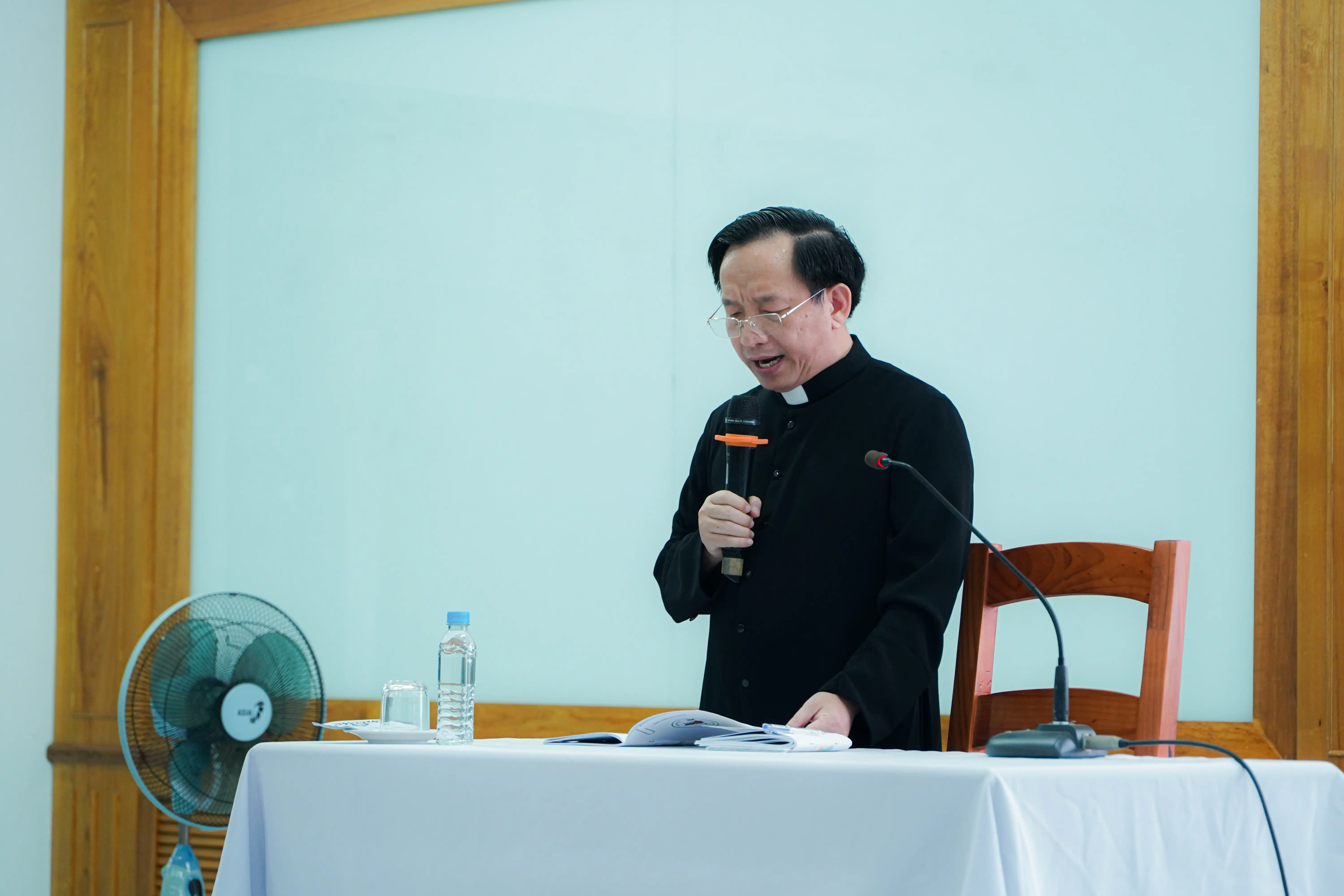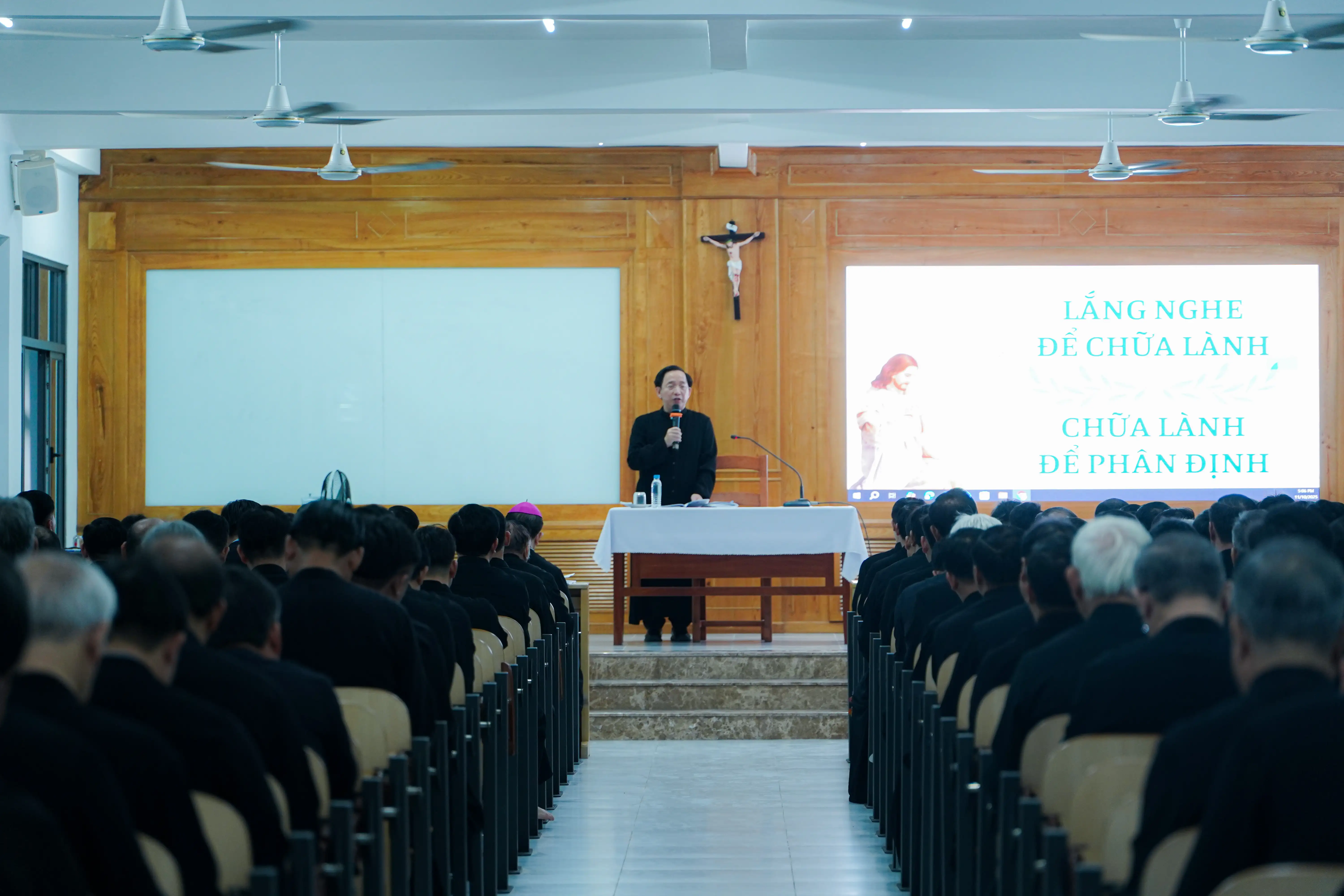 Đến 18g00, quý cha cùng dùng cơm tối tại nhà ăn Cơ sở Đào tạo, trong bầu khí huynh đệ và ấm áp. Buổi tối, vào lúc 19g15, các cha quy tụ trước Mình Thánh Chúa trong giờ Chầu Thánh Thể, cùng chiêm ngắm, cầu nguyện và phó dâng hành trình tĩnh tâm cho Chúa Giêsu Thánh Thể. Sau giờ chầu, quý cha trở lại hội trường để chào đón Cha Giảng phòng – Cha Giuse Trần Tấn Lực, và lắng nghe ngài chia sẻ bài giảng mở đầu tuần tĩnh tâm với chủ đề: “Lắng nghe để chữa lành, chữa lành để phân định”.