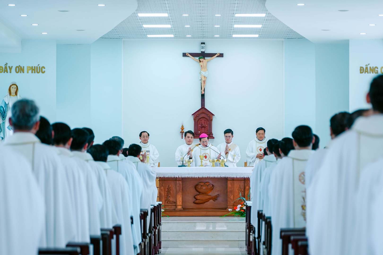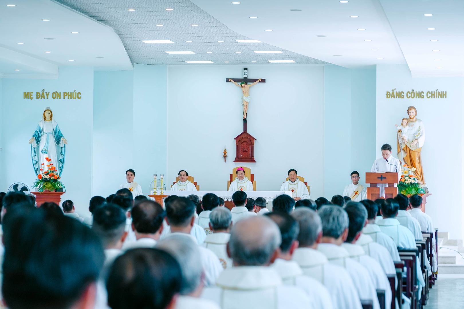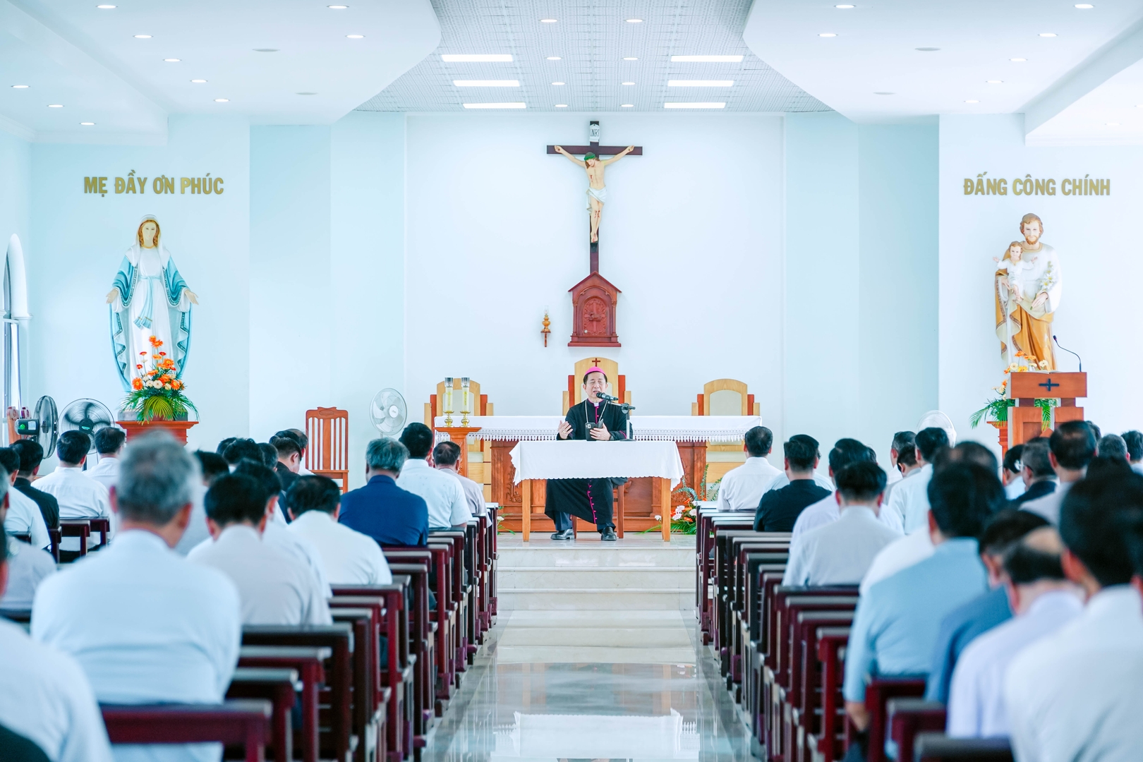 Cao điểm của ngày tĩnh tâm là thánh lễ tạ ơn. Trong bài giảng, Đức cha Giuse mời gọi quý cha và quý thầy luôn sống căn tính người môn đệ Chúa Giêsu với lòng thương xót cụ thể, đặc biệt đối với những người bé mọn, đau khổ và cần được nâng đỡ. Đây không phải là lời mời gọi mới nhưng là lời nhắc cần thiết để đời mục tử luôn được quy chiếu về Tin mừng.