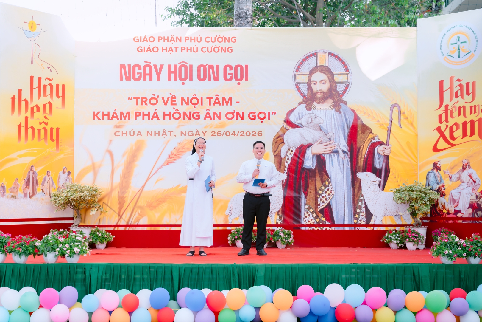 Sau phần khởi động sôi nổi từ sáng sớm, chương trình chính thức khai mạc lúc 8g00, với sự hiện diện của cha Gioakim Lê Công Thành, Tổng đại diện Giáo phận Phú Cường, cùng các cha bề trên và đặc trách ơn gọi của Giáo phận và các dòng tu.