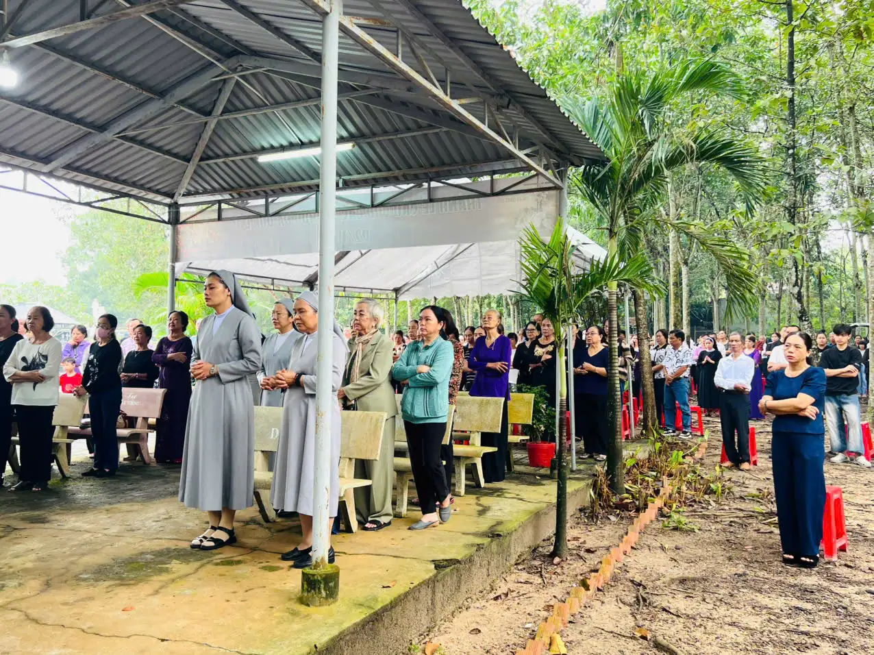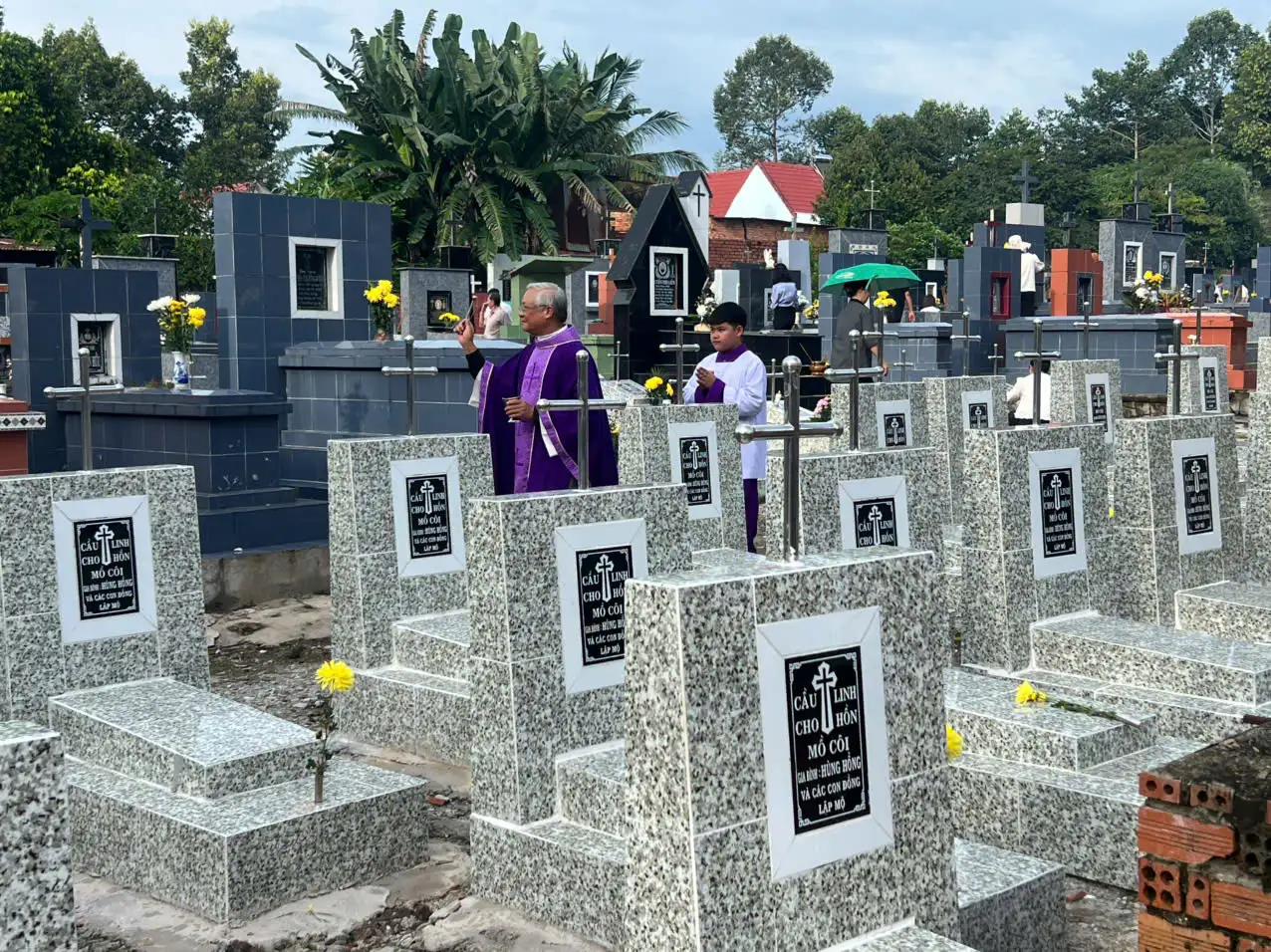 Sau phép lành cuối lễ, cộng đoàn cùng tham dự nghi thức viếng Đất Thánh – đọc một Kinh Lạy Cha, một Kinh Tin Kính cầu nguyện cho các linh hồn được hưởng ơn toàn xá. Quý cha sau đó đã làm phép khuôn viên Đất Thánh, trong khi các tín hữu chia nhau đến từng phần mộ để dâng hương, dâng hoa và lời nguyện cho người thân yêu đã khuất.