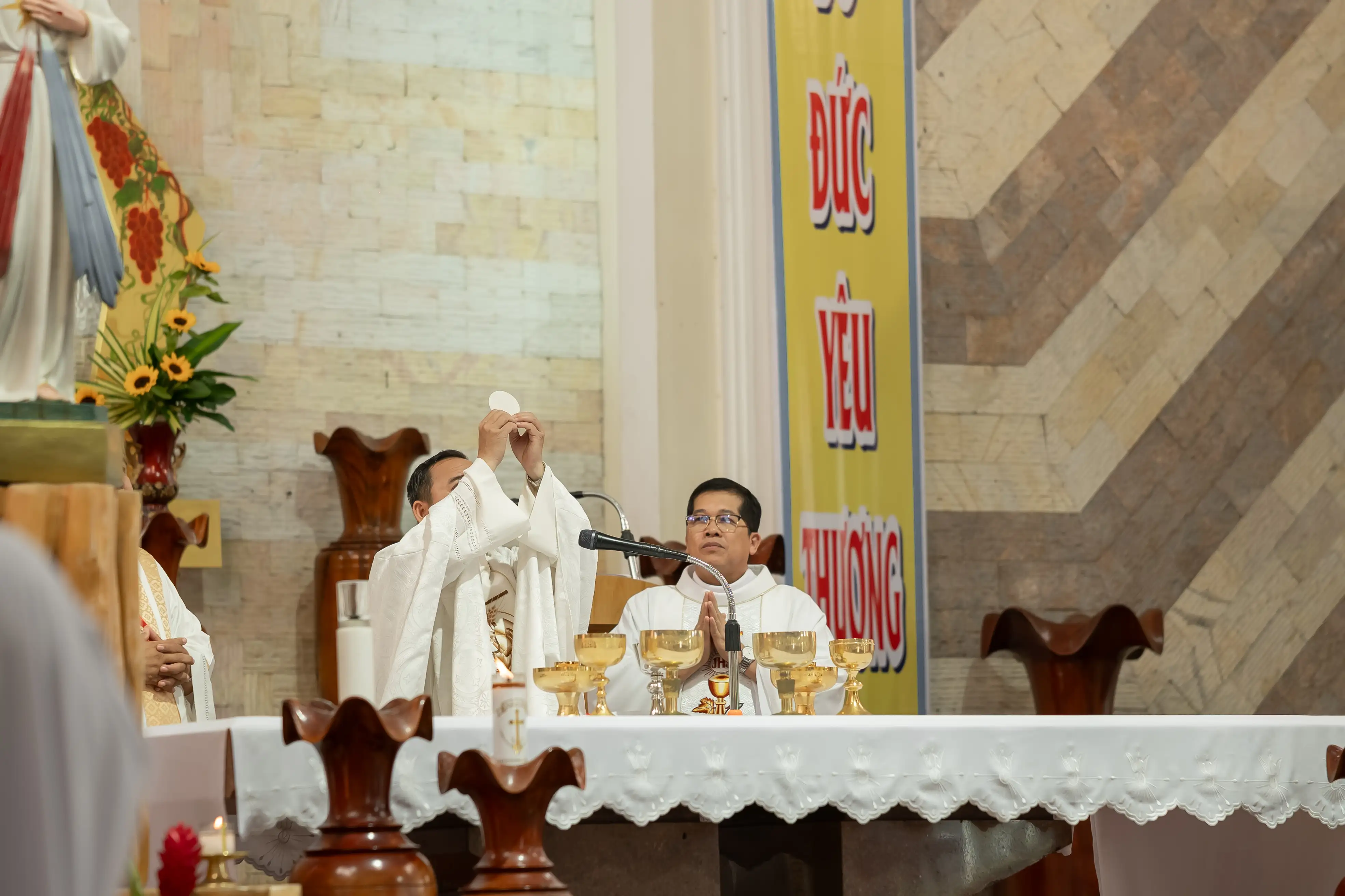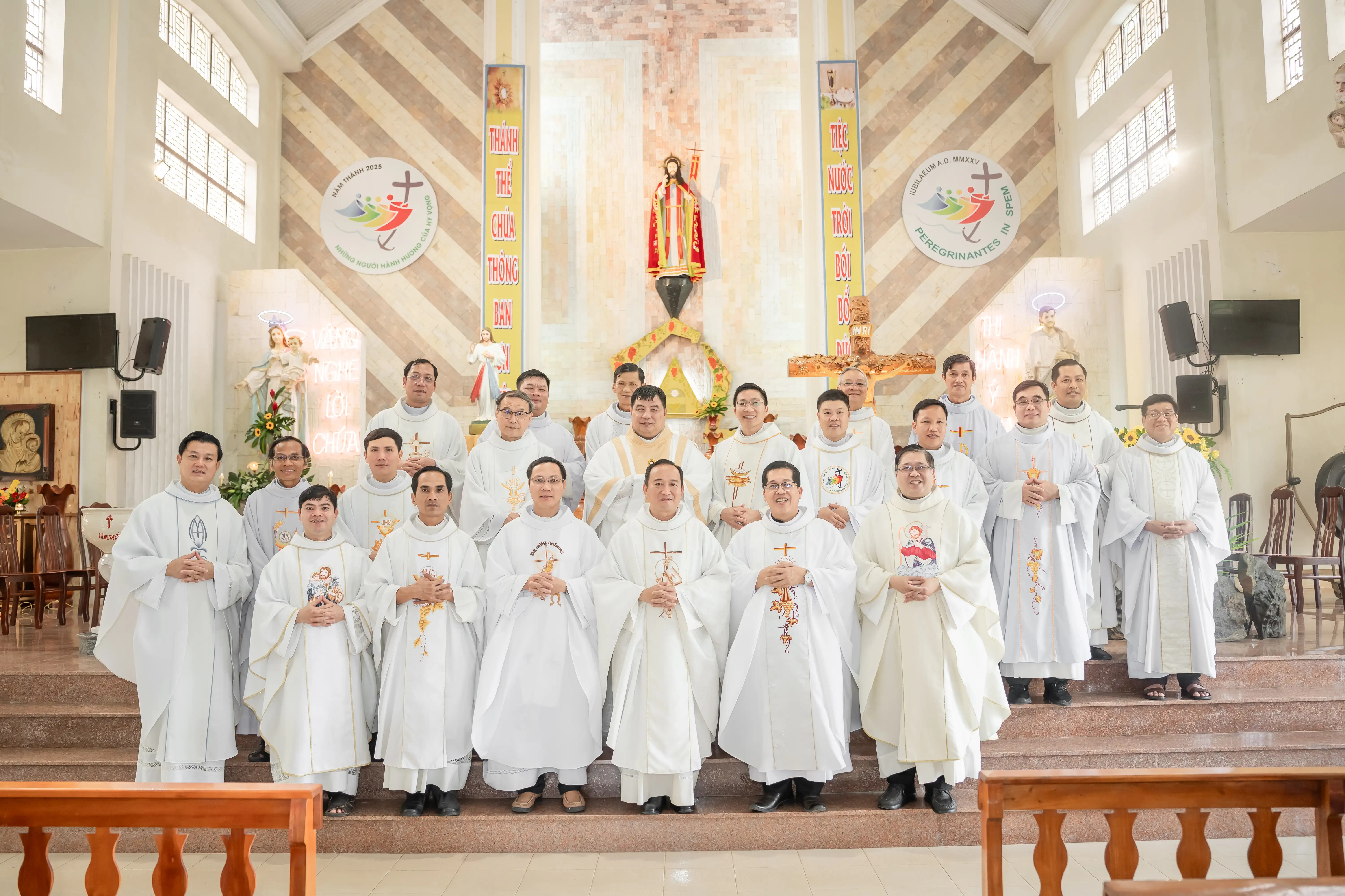 Đỉnh cao của ngày hành hương là thánh lễ trọng thể lúc 9g30, do Cha Vinh Sơn Nguyễn Đăng Khoa - Quản hạt Bến Cát, chủ tế, cùng đồng tế là quý cha trong Giáo hạt. Hiệp thông trong Thánh lễ còn có sự hiện diện của quý Sơ, quý Thầy, và đông đảo giáo dân từ các giáo xứ trong toàn Giáo hạt. Trong bầu khí linh thiêng này, mọi người cùng dâng lời cảm tạ Thiên Chúa vì hồng ân Năm Thánh – hồng ân của hiệp nhất, yêu thương và đức tin.