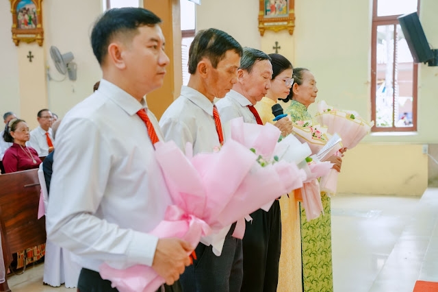 Sau phần hiệp lễ, vị đại diện Hội đồng Mục vụ Giáo xứ thay mặt cộng đoàn chúc mừng quý cha mới, đặc biệt cha Matthêu và cha Giuse, đồng thời dâng lên quý cha món quà của cộng đoàn. Hai cha Matthêu và Giuse tặng hoa cho thân phụ với lòng biết ơn chân thành những bậc sinh thành đã không quản công khó nuôi dưỡng và dâng con cho Chúa, để con trở thành linh mục của Chúa. Quý cha cũng dâng lên bó hoa tươi thắm cho cha sở Gioakim và cha nghĩa phụ trong tràng pháo tay của cộng đoàn.
