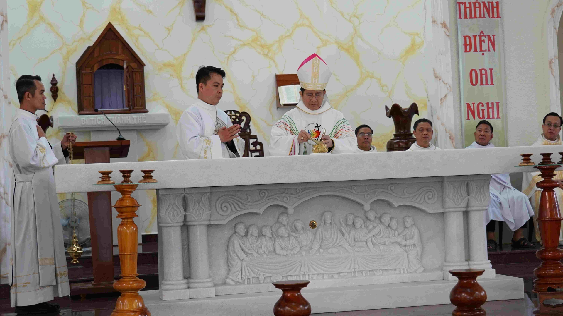 Khởi đầu Phụng vụ Thánh Thể, Cha Tađêô Lý Nguyễn Anh Thy – Chánh Văn phòng Tòa Giám mục – đã công bố Chứng chỉ Cung hiến Nhà thờ và Bàn thờ Giáo xứ Thiên Ân. Theo đó, bàn thờ của giáo xứ được niêm phong xương thánh tử đạo Linh mục Phaolô Lê Văn Lộc.