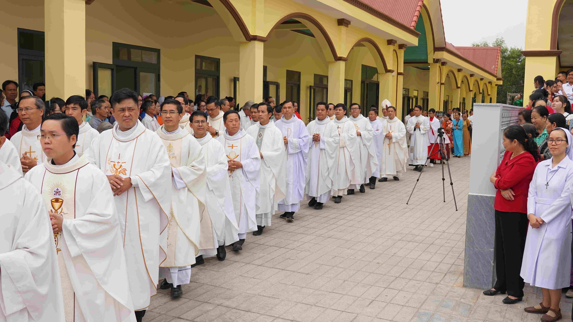 Thánh lễ được khai mạc với đoàn đồng tế tiến vào ngôi thánh đường mới. Trong lời chào đầu lễ, Đức cha Giuse nhấn mạnh ý nghĩa thiêng liêng và mục vụ của công trình được cung hiến, ghi nhận sự đóng góp và hy sinh của cộng đoàn giáo dân, cùng quý ân nhân trong suốt gần bốn năm xây dựng, kể từ ngày đặt viên đá đầu tiên vào 26/11/2022, như dấu chỉ của sự quan phòng và chúc lành của Thiên Chúa, qua lời chuyển cầu của Đức Maria và hai thánh quan thầy Phêrô và Phaolô.